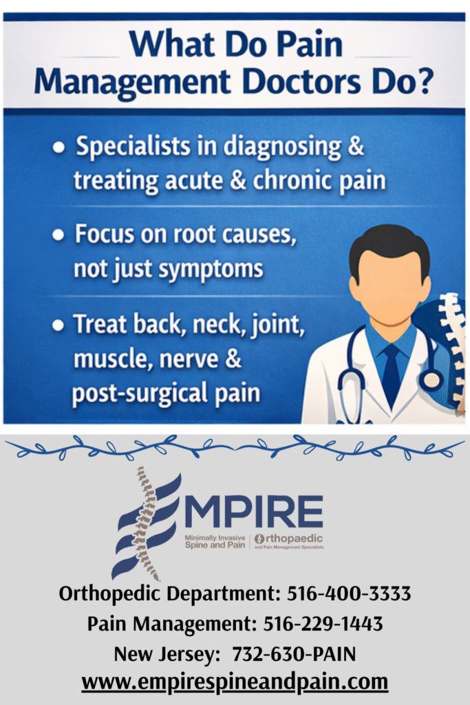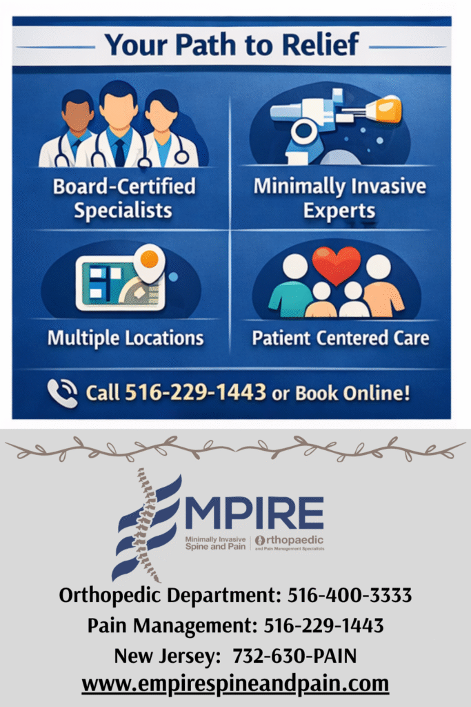 Pain is more than an occasional inconvenience—it can affect your work, sleep, and quality of life. If you’re struggling with persistent pain, a pain management doctor may be your key to relief. At Empire Minimally Invasive Spine & Pain, our specialists in Plainview, NY, New Hyde Park, NY, and across New Jersey, focus on diagnosing the root causes of pain and providing individualized, minimally invasive treatments designed to restore function and improve daily living.